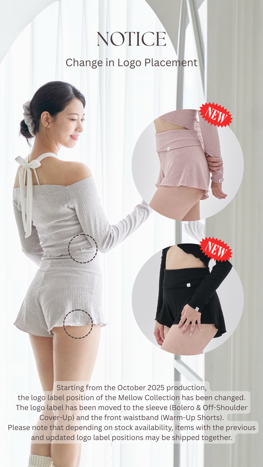 ▽'모네 홀터탑(화이트-핑크)', '멜로우 웜업쇼츠(오트밀 그레이)',